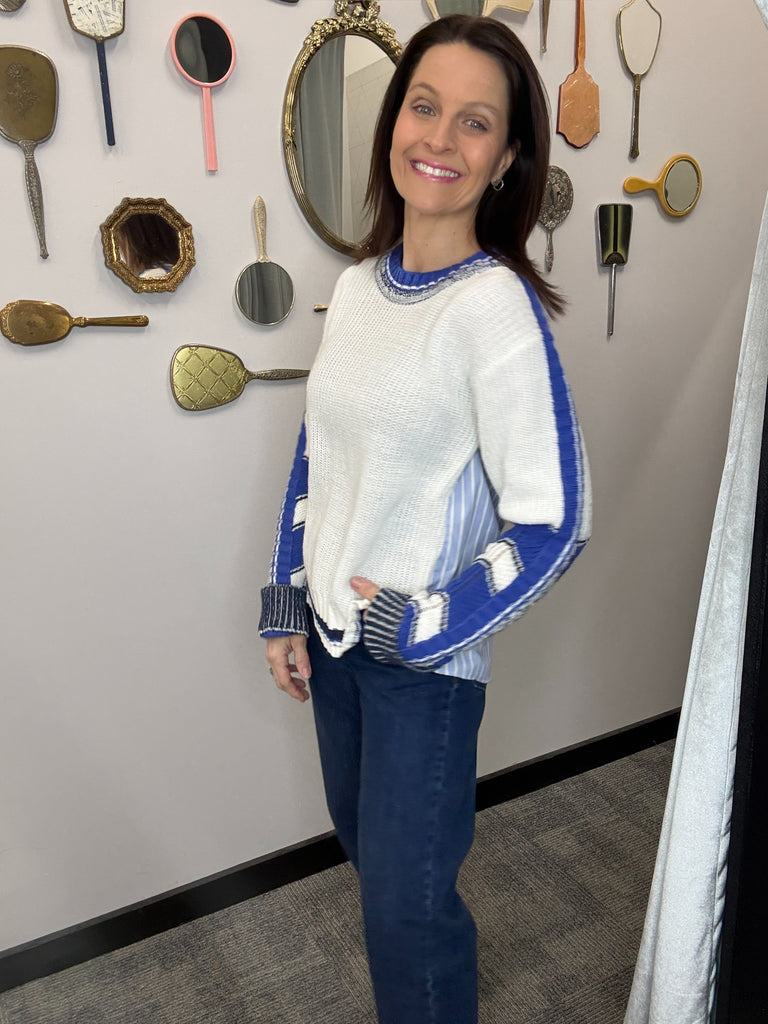 This refined sweater features a soft, comfortable construction with a classic ribbed crew neckline that provides timeless appeal. The distinctive graphic stripe detail across the back adds visual interest and sets it apart from standard knitwear. Practical side slits enhance movement and create a relaxed, modern silhouette that pairs effortlessly with your favorite denim or trousers.