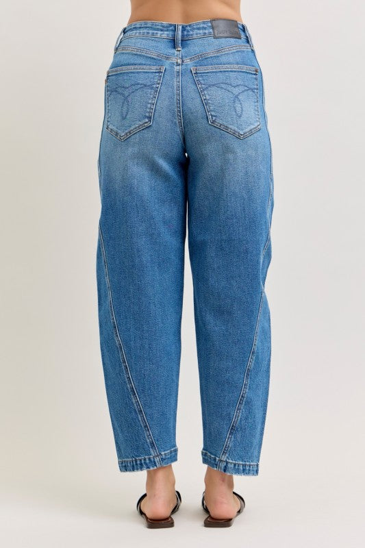 Judy Blue's barrel leg jeans deliver a contemporary silhouette with a high-waisted cut that flatters and elongates. The rigid fabric maintains its shape throughout the day, while the magic panel at the waist provides seamless support and comfort. With an 11.5" rise and 28.5" inseam, these jeans offer a refined fit that works for various body types. The barrel leg creates a modern, tapered look from hip to ankle, making them versatile enough for casual wear or dressed-up occasions.
