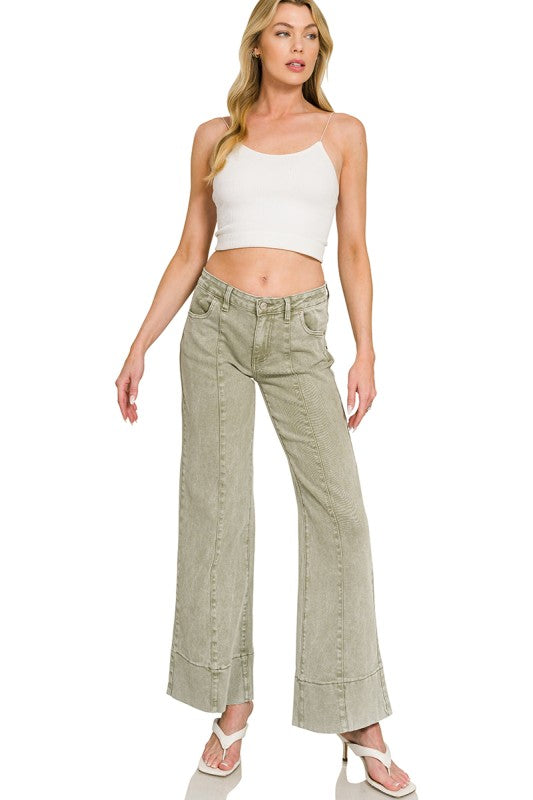 Effortless style meets comfort in these mid-rise wide-leg denim. Crafted in a sophisticated olive green, they feature a 9.25" rise and relaxed 31" inseam for a flattering, modern silhouette. Perfect for dressing up or down, these versatile jeans transition seamlessly from casual weekends to polished everyday wear. The wide-leg cut offers freedom of movement while maintaining a refined, put-together look.