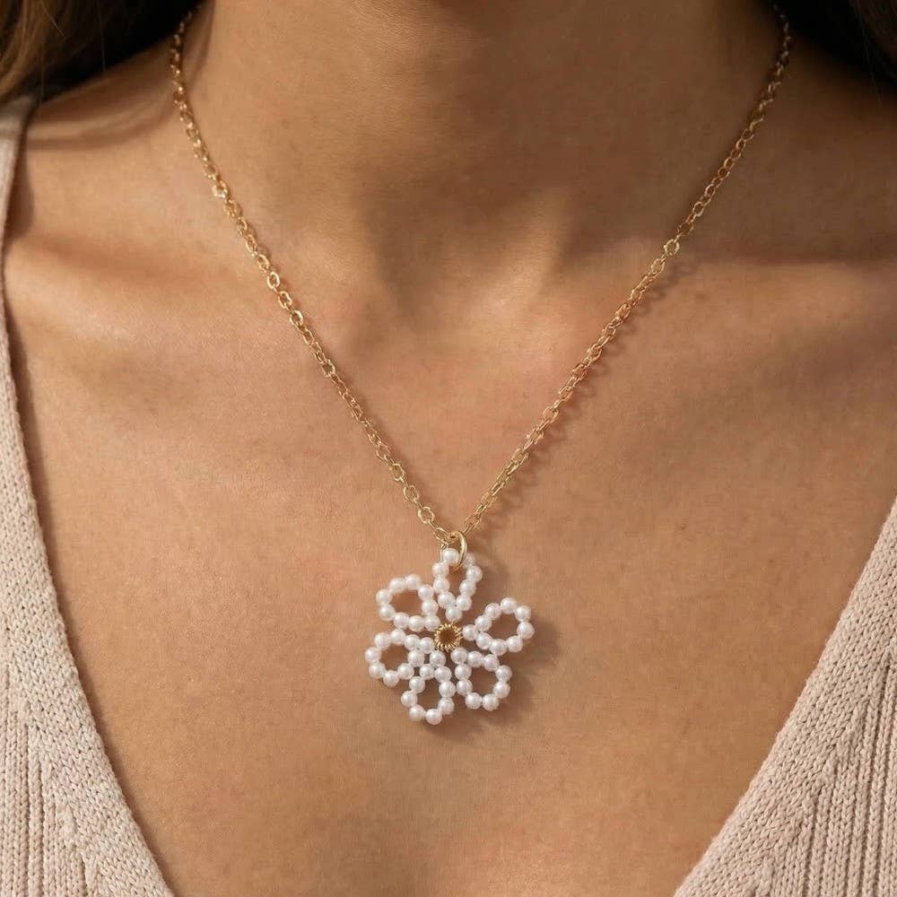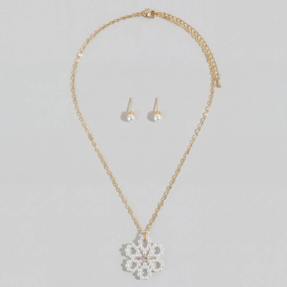 This piece is both timeless and contemporary, this chain necklace incorporates a remarkable pearl beaded flower pendant set design. It also includes a metallic stud earrings. A stylish accessory that's perfect for complementing your favorite outfit. Available in CRMGD and CRMSIL. This item is sold in packs of 2.
