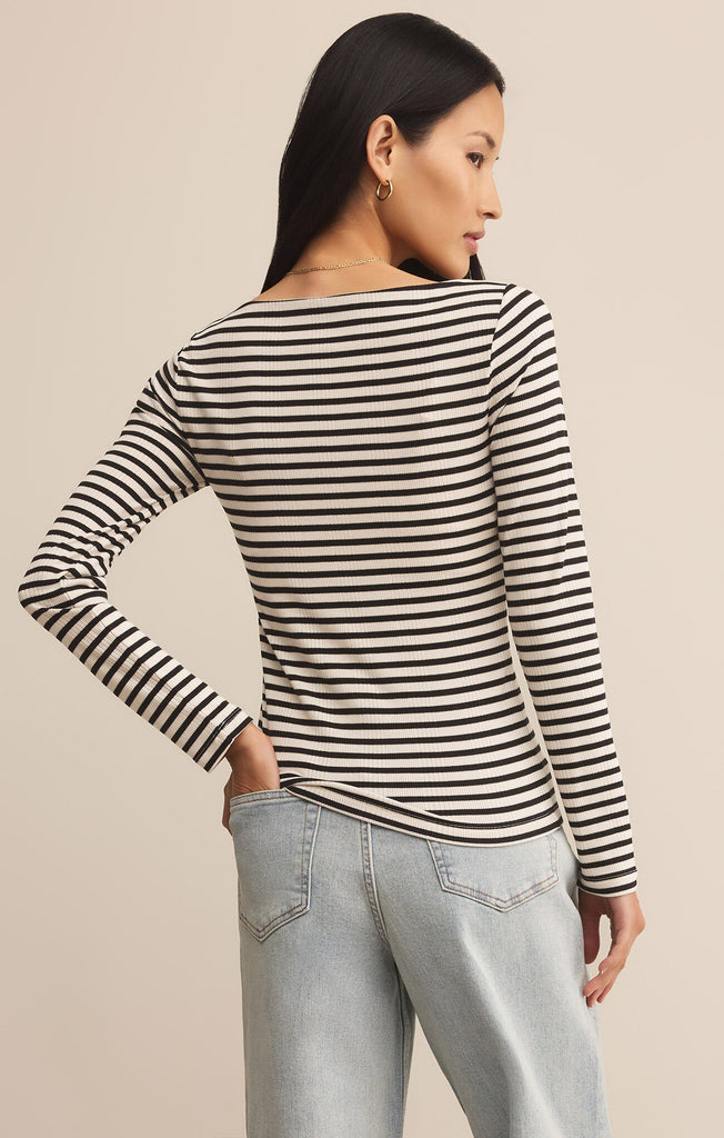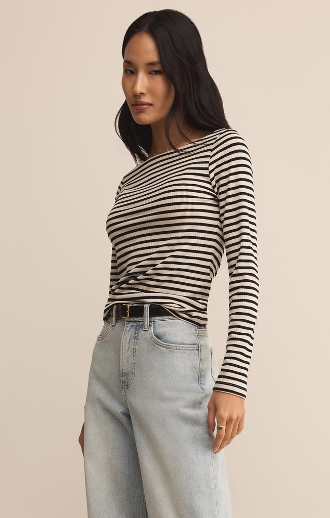Say hello to your new layering fave; a fitted, striped rib tee with a chic boat neck and sleek, stretchy feel. This is everyday polish, made effortless.