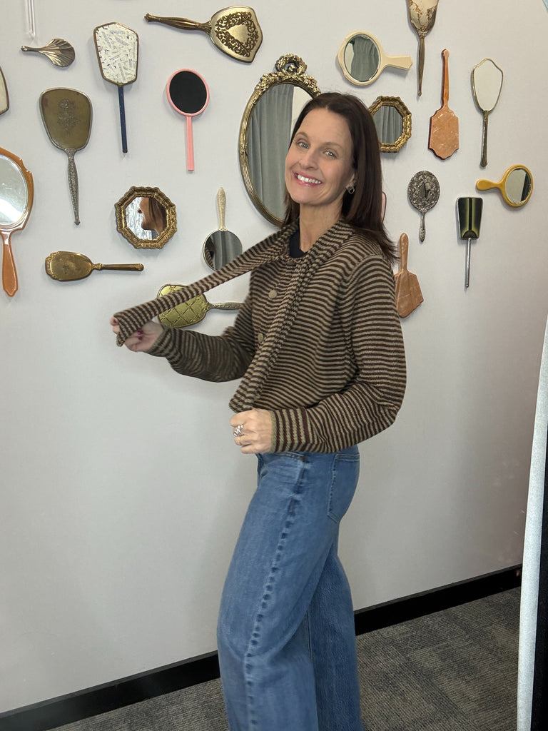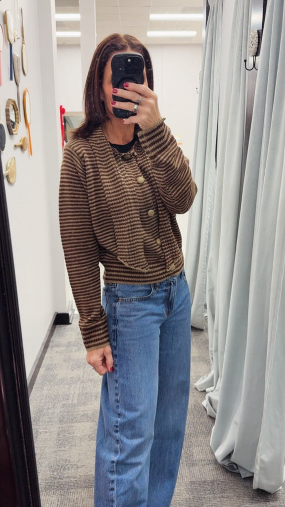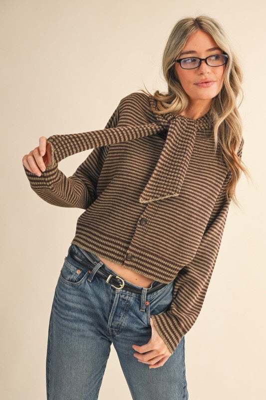 Effortlessly layer this striped cardigan, designed with a relaxed bodice that drapes beautifully without clinging. The attached neck scarf adds instant sophistication and eliminates the need for additional accessories, making it a versatile piece for transitional seasons. Perfect for creating polished, put-together looks with minimal effort.