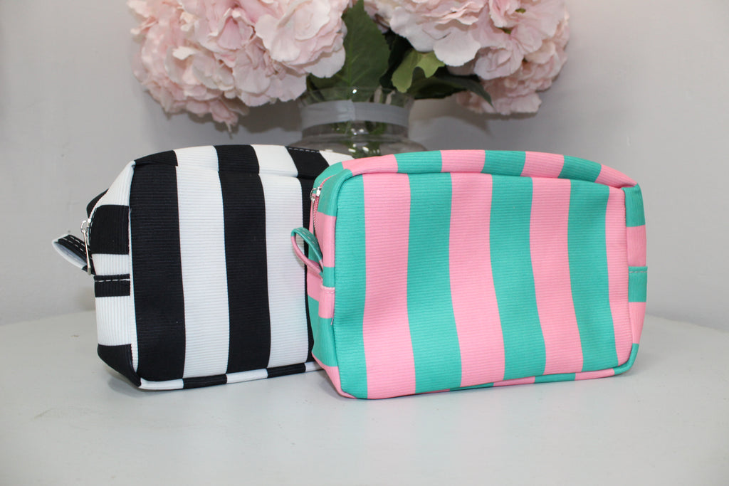 Keep your essentials organized with this charming striped cosmetic pouch. Featuring a secure zipper closure, it's perfect for storing makeup, skincare products, and travel necessities. The compact design fits easily into bags and luggage, while the durable construction ensures your items stay protected. Available in versatile striped patterns that complement any style.