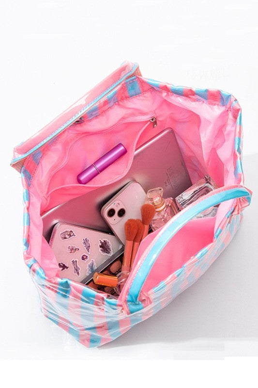 Carry everything you need with this vibrant striped tote bag, designed for beach days and poolside adventures. The spacious interior holds towels, sunscreen, and all your essentials, while durable PVC material resists water and wear. A secure magnetic closure keeps your belongings safe, and an inner zipper pocket provides convenient storage for smaller items like keys or sunglasses. Perfect for summer outings.
